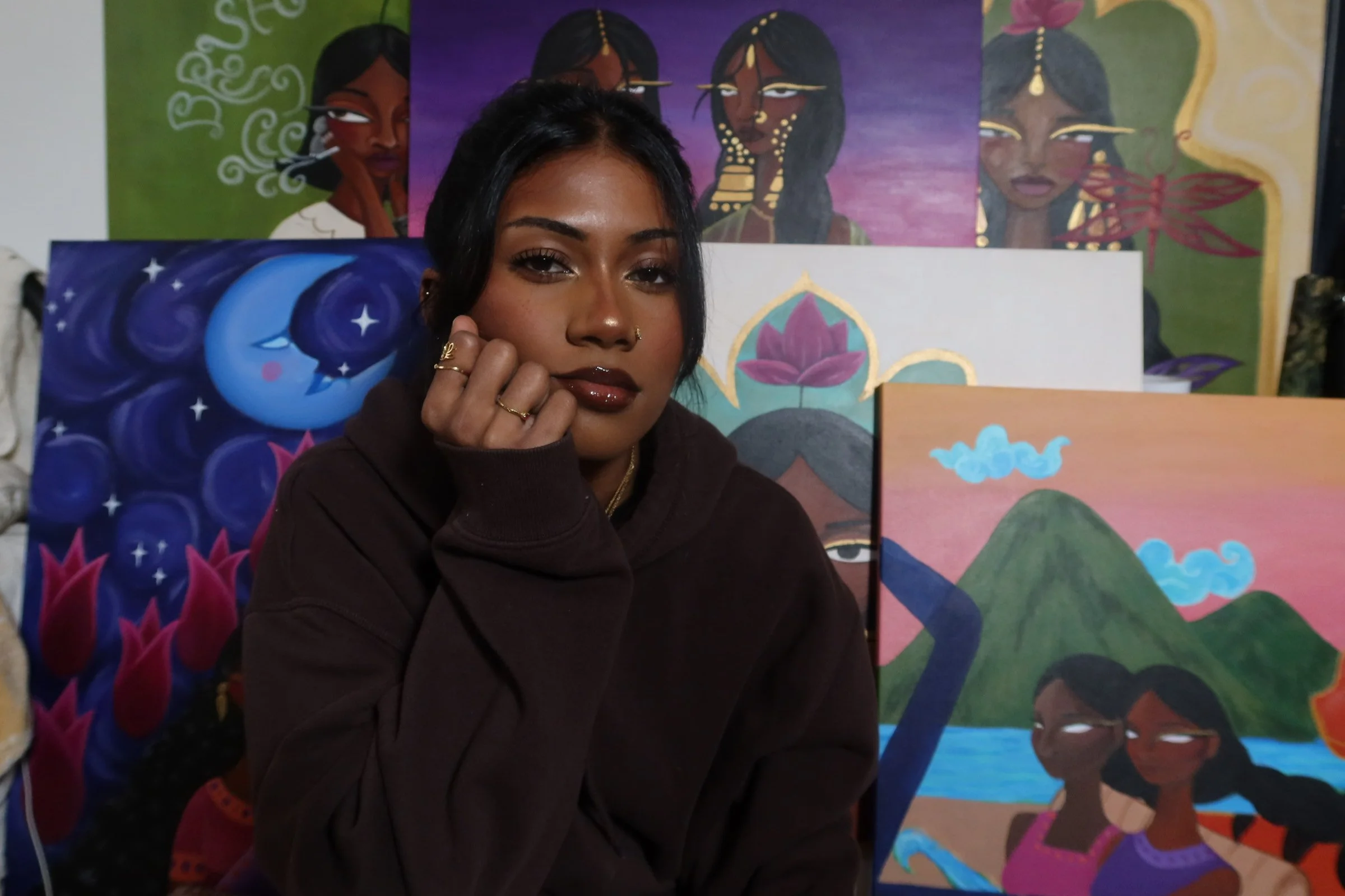 We spoke to Eliza, a NYC-based artist whose work centres on the romanticisation of South Asian women, and uses her art to reimagine a world where brown women unapologetically take up space and reject colonial beauty standards. Each piece begins as a quiet protest against colourism, visibility and the narrow standards and expectations imposed by dominant cultures, ultimately serving as a love letter to her younger self.